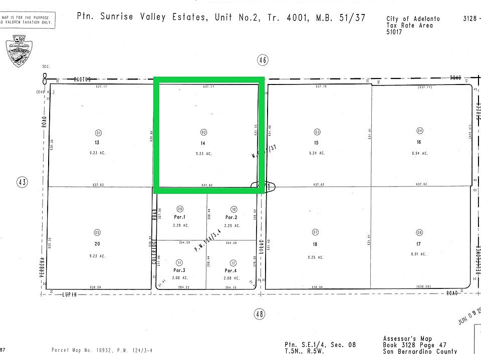 Spanning around 10 acres and is conveniently located near Donald F. Bradach Elementary School, the newly constructed Adelanto High School Campus, and Victoria Magathan Elementary School. Adjacent to these educational institutions, one will find community tract homes, all located within the High Desert region. Use GPS coordinates 34°32'07.7"N 117°25'21.2"W or 34.535472, -117.422556 Actual Lot size is 9.23 acres.
