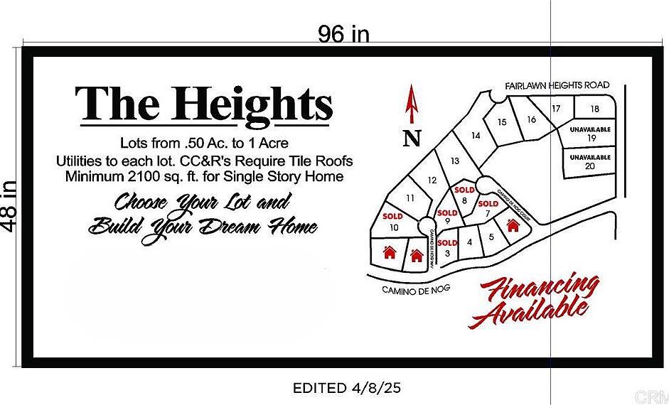 LOTS CAN BE PURCHASED SEPARATELY. 10 LOTS in Subdivision available, Final Map, CC&R's & roads . An opportunity to build the home of your dreams in a desirable area of Fallbrook. Building Sites from .50 Ac Net to 1+Ac Net. Nestled in an impressive neighborhood of Fallbrook some lots with rolling hills and neighborhood views. Best of all, close to Fallbrook High School, town, shopping, schools and services. Paved roads, water and sewer available in street, utilities to lots, CC&R's, minimum 2100 SF for one story, two story minimum 2600, Tile Roof residence. Attached Road Maintenance Agreement. Buyers to do their own due diligence verifying all information. Show anytime....