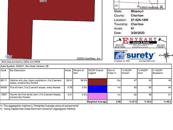 ONLINE-ONLY AUCTION - Price Shown ($5,000/acre) is the Starting Bid and Not a Listing Price! Property will not sell before the auction - Bidding begins April 21st and ends April 26th at 7:00 pm (CST). 91.55 Acres m/l: Located 6 miles Northwest of Glasgow in the Aholt Bottom. This highly productive bottom farm is 99% tillable, featuring 90 tillable acres and several mature pecan trees along the North side. The property has been well maintained by the current tenant with the ground worked and ready for soybeans this Spring. 13-50-70 NPK fertilizer and weed control spray were applied last Fall. Free & clear for 2023 planting season. Property rarely trades hands in this area, so don't miss the opportunity! TERMS OF AUCTION: 10% of purchase price as Earnest Money deposit day of auction. Balance due upon closing within approximately 30 days. Buyer must have financing secured prior to bidding. Possession granted upon closing. Property is sold in AS-IS condition with no contingencies. Sale is subject to seller approval. Property is free & clear of leases for the 2023 growing season. Buyer may begin planting prior to closing once earnest money is received. Contact the auction company with any questions.
