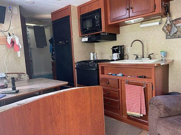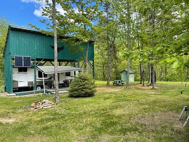 Looking for privacy? This is the perfect location for your permanent home or vacation spot. Meandering driveway leads to a clearing all set for you to build your home. Currently a 29' 2012 Dutchman travel trailer sits on the property protected by a stick built open canopy. Two out buildings house your tools and toys. No well or septic but there is a rain catch system for water supply.
