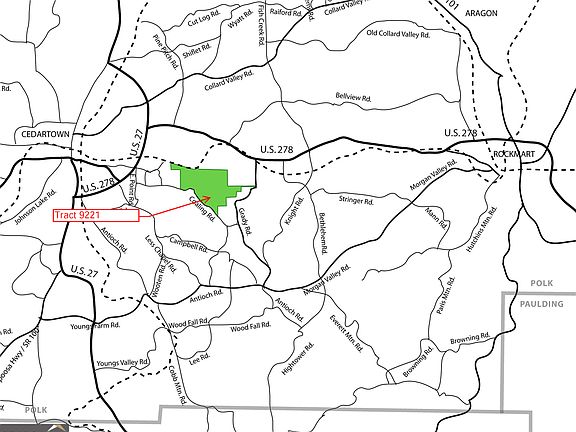 This parcel is divided from a larger tract. Rolling timberland with elevated long range views. Located between Rockmart and Cedartown in Polk County, Georgia. Portions of this tract have been clear-cut. This parcel has great potential to be a showplace farm or family compound. It just needs an owner with vision who likes a project. Approx. 1 hour west of Marietta.
