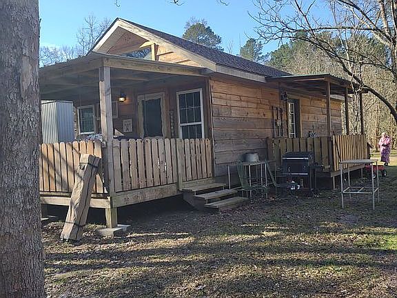 Has a 10×16 covered porch. 2×6 tounge and groove flooring. Wood walls.