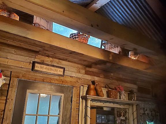 Washtub sink in kitchenWood wallsCedar sidingShingle roof