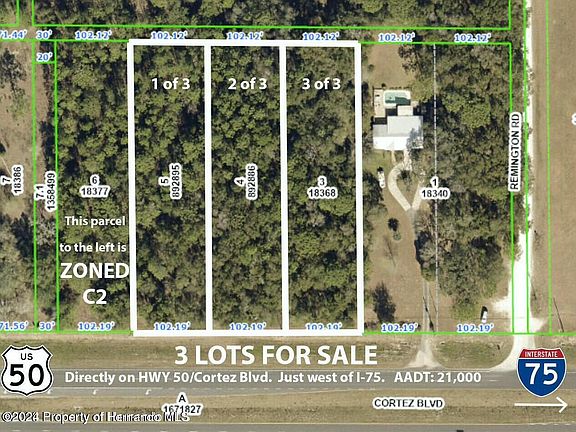 3 LOTS for sale directly on Cortez Blvd (HWY 50)...just west of I-75! Growing area!! New subdivisions going in nearby! Future growth is on the horizon! AADT: 21,000 and growing! The two lots to the right are also available by a different seller; inquire if interested in all 5 lots. The lot directly to the west is zoned C-2, so these lots should be easy for the buyer to rezone to commercial. Sellers are accepting a contract contingent upon the buyer rezoning the property to commercial. Each lot is almost 1 acre for a total of almost 3 acres. All 3 lots are being sold together. Parcel #: R36 122 20 0770 0000 0050 and Parcel #: R36 122 20 0770 0000 0040 and Parcel #: R36 122 20 0770 0000 0030.