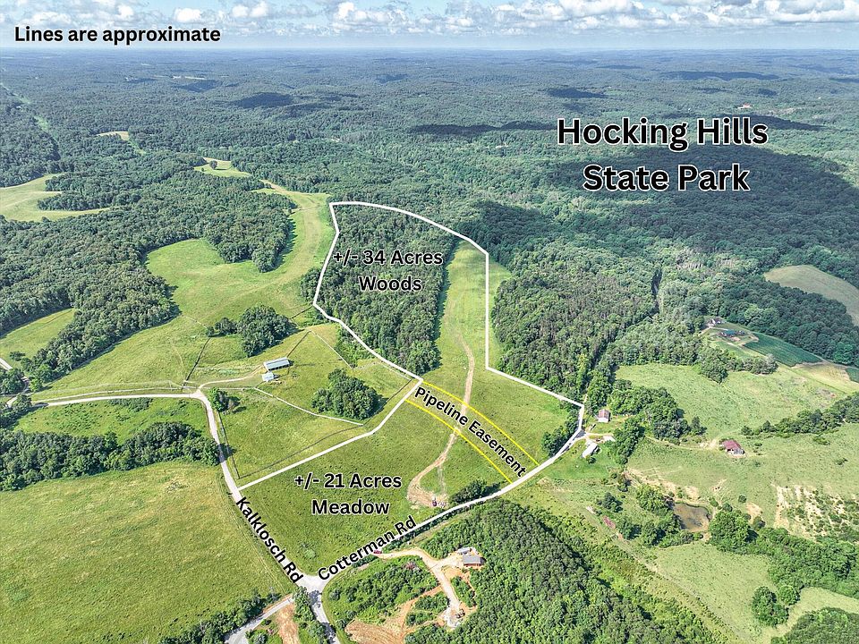 Land for sale in Hocking County, Ohio. Located just a short drive from Hocking Hills State Park, this 55 acre tract of vacant land offers lots of opportunities! Access to the property is easy with road frontage on both Cotterman Rd and Kalklosch Rd. There is approximately 20 acres of meadow on the property that is ideal to build a home and/or fence for pasture. The wooded portion of the property has been recently logged with plenty of trees remaining. Electric service is available along the road frontage. An additional contiguous 81 acres is also available to purchase. The properties deed restrictions prevent any short term rentals and one dwelling may be built on the property. All mineral rights transfer. A new boundary survey will be completed prior to closing.