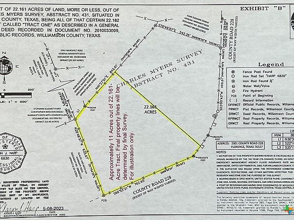 Exceptional Opportunity: Tranquil 11-Acre Gentleman's Ranch.. Discover the perfect canvas for your dream estate 11-acre parcel of land, just outside of Georgetown. Enjoy the benefits of agricultural exemption, ensuring low taxes and endless possibilities for your future home in Florence Texas ! Create your own private oasis or develop a family retreat. Benefit from essential amenities with a 6” City of Georgetown utilities line along CR 228, and PEC electricity for your future plans. A wet weather creek is along one property line , enhancing the natural beauty while offering a serene backdrop for leisure or outdoor activities. Seller-imposed deed restrictions maintain the charm of the area, ensuring no mobile homes or off-site structures are placed on the property. Whether you envision a tranquil ranch, a vibrant garden, or simply a peaceful retreat, this prime piece of land is ready for your vision. Schedule your visit today and unlock the potential of this property!