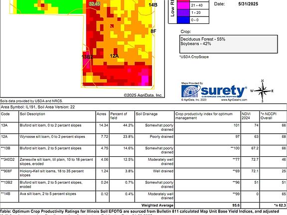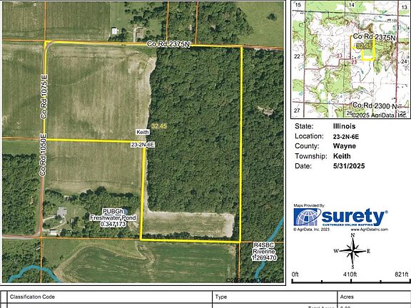 30 +/- acres combination of farmland & recreational land. Approximately 16.39+/- acres tillable. The wooded section is hilly with mature trees and an abundance of turkey and deer. This farm has good soil types and lays very well with just enough slope for drainage. Access from North and West. Legal: PART OF THE SW1/4 NE1/4 OF SECTION 23, TOWNSHIP 2 NORTH, 6 EAST, WAYNE COUNTY, ILLINOIS Listing Broker can provide Pin Drop for GPS. Mineral Rights: Mineral Rights unknown. Possession: The current tenant has farming rights for the 2025 farming season(thirds). Soil Types Tillable Acreage: Mostly Bluford & Wynoose Silt Loams (See soil map in photos for details.) Real Estate Taxes: $275 Sellers are not required to ask for highest and best and may reject any or all offers. Seller requires 7 days to respond to offers. All offers must include preapproval or verification of funds. The information is believed to be accurate; however, no liability for its accuracy, or errors or omissions is assumed the owners or Listing Broker/Brokerage. All lines or sketches drawn on maps, photographs, etc. are approximate. There are no expressed or implied warranties made by the Seller(s) or Listing Broker/Brokerage pertaining to this property. Real estate is being sold 'As Is, Where Is'.