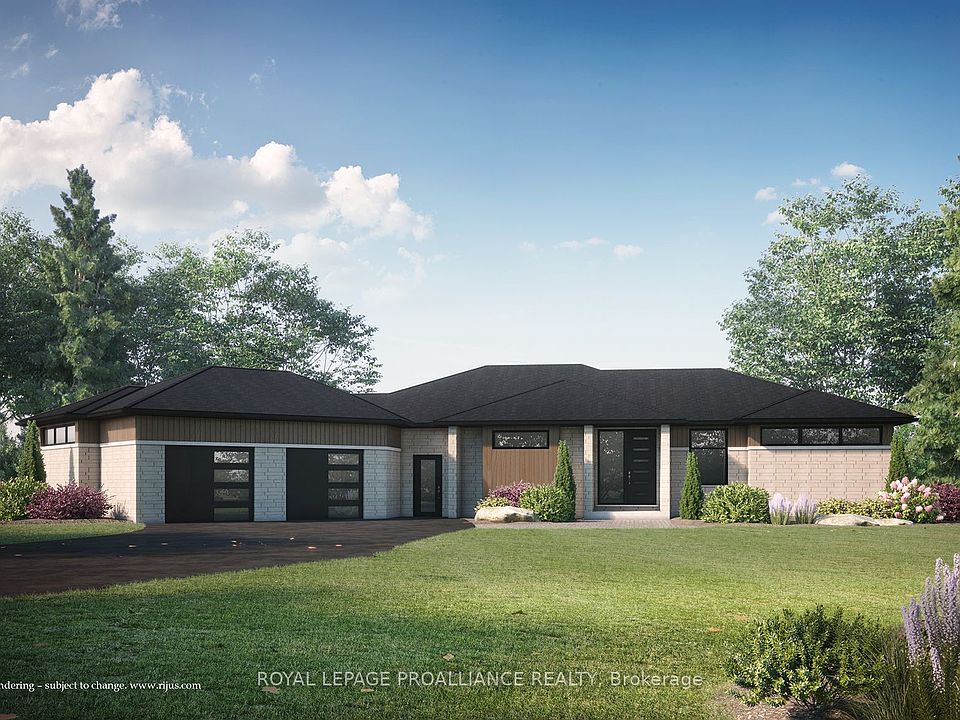 New home to be built! Experience premium living in this stunning modern 3-bedroom, 2-bathroom bungalow, perfectly situated on sought-after County Road 3 with breathtaking views overlooking the Bay of Quinte, and Trenton Airbase, and downtown Trenton, ON. This home is defined by its luxurious finishes, including Quartz Countertops, soft-close drawers, and high-end luxury vinyl plank and ceramic flooring throughout The spacious, open-concept main floor features 9-foot ceilings, large windows allowing for lots of natural light. The gourmet kitchen is well laid out with a large island and separate Pantry area. The Great room provides a centerpiece with a large, modern fireplace featuring a ceramic surround, and offers easy access to the 16 x 16 partially covered deck, perfect for utilizing the spectacular views. The Primary Bedroom includes a walk-in closet and a 4-piece ensuite, complete with a custom walk-in ceramic/glass shower. The 2 additional large bedrooms and separate 4-piece bath area at the other side of the home, allowing for more privacy in the Primary bedroom. Convenience is key with a functional Mudroom/Laundry area with built-in cabinetry, connecting the living space to the oversized 2-bay garage which includes an ample storage area. This home also features a walk-out basement with a finished recreation room, den/office, and 3 piece bathroom. From the walk out is an interlocking patio area to further extend the outdoor living space.