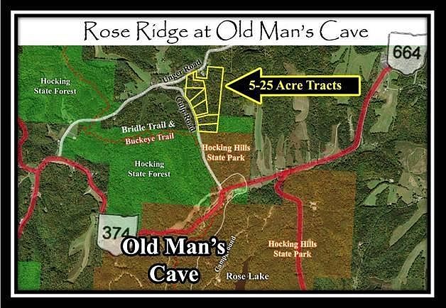 Rose Ridge at Old Man’s Cave 5-25 Acre Luxury Cabin and Custom Home Sites Hocking County, Ohio • 7 Tracts from 5.0 to 25.746 Acres (New Survey 2016) • On Hocking Hills State Park at Old Man’s Cave • Luxury Cabin and Custom Home Sites • New Gated Driveways Installed to Prime Building Sites • Tracts will all have septic approval • All tracts have multiple building sites • Great Access from the properties to the extensive Hocking Hills Bridle Trails • Easy walk to Old Man’s Cave, Archery Range and Rose Lake • Short Hike to Cedar Falls • New Deed Restricted Cabin Community • Choose Your Own Builder - No Time Limit To Build • Logan Hocking School District • Benton Township, Hocking County • Parent Parcel # 01-000016.0200 From $72,900 to the $249,900