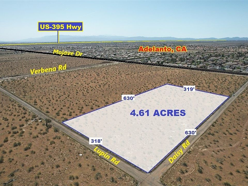 Great piece of property to build your Dream Home or investment, flat property 4.61 Acres at the southeast corner of Daisy Rd & Lupin Rd, zoned Residential- rural living within the county of San Bernardino, and close to well-developed communities in the new Adelanto area,and new active residential developments, only 628 ft from paved Rd Mojave Dr., walking distance from schools, located only ½ mile from Donald F Bradach Elementary School & ½ mile from newly built state-of-the-art Adelanto High School Campus serving over 1,750 students, make an offer today before is gone.