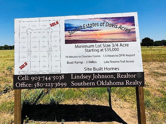 Welcome to Sunset Estates near Lake Texoma! Build your barndominium, lake house, or dream home on an expansive .75 acre lot. These lots are an ideal match for individuals who cherish fishing, boating, and the serene lake lifestyle. Imagine unwinding with leisurely strolls to the lake, where you can enjoy breathtaking sunsets reflecting on the water. This prime location offers convenient access to a Lake Texoma trail, a boat ramp 2 miles away, a quick 18-minute drive to Choctaw Casino, and seamless travel with a 1.5-hour journey to DFW airport. Choose from a selection of seventeen .75 acre lots at $35,000 or two .94 acre lot at $40,000. Only site-built homes are permitted, and RVs or mobile homes are not allowed within the community. Don't miss out on this opportunity! Your perfect haven awaits, and you can secure your future home on one of these exceptional lots. Call today to schedule a showing!