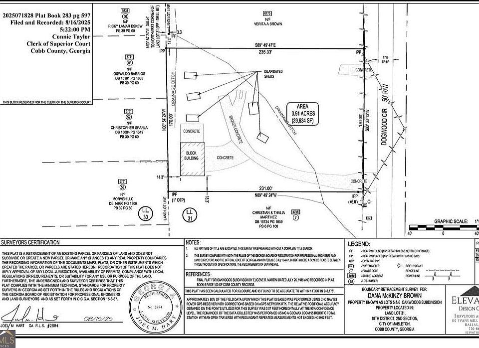 An opportunity for nearly a full acre on Cobb County awaits! This .91 acre lot sits adjacent to some newer construction homes with some new bulbs being developed across from it. This lot features a large, concert block garage with two large bay doors, driveway access from the road, large hardwood trees, and quick and easy access to I-20, 278, 78, Austell, and Mableton. Power and water are easily available at the road frontage making this a perfect lot to build a home, or develop and sell for a profit. A survey has been completed and filed with the county and available upon request. Currently zoned R3. For exact location, search 5758 Dogwood Cir, and the wooded lot to the right is the property for sale.