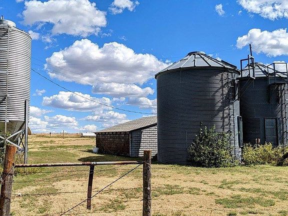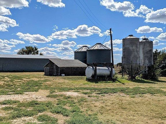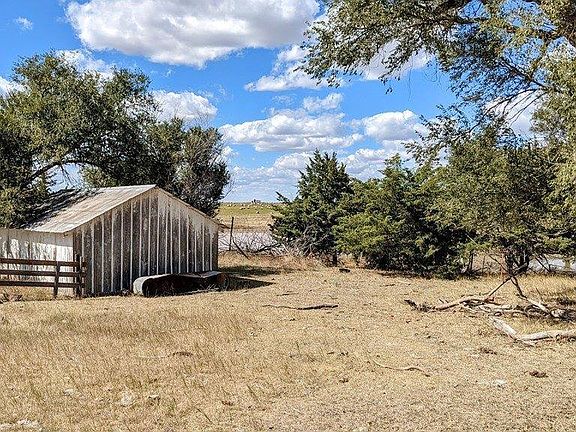 Historic homestead in Lane County, Kansas. Built in 1927, the farmhouse is craftsman style with a pleasing stucco exterior, steel roof and broad front porch, shaded by mature pines and wrapped by a picket fenced yard--just like in yesterday.