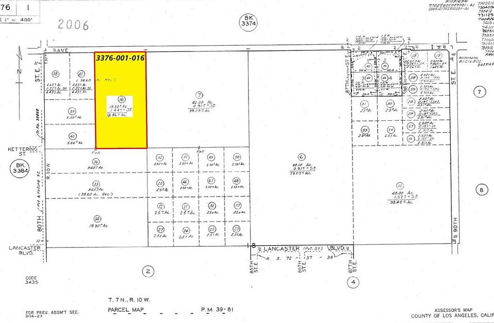 APN: 3376-001-016 Coordinates: 34.704667, -117.984000 19.87 Acres for sale in LA County. This lot is located near the intersection of E Ave I and 80th St E in Lancaster, CA. Property has frontage onto a paved street with electric poles for future power hook up. Excellent location in a rural area and zoned LCA11, per county record, for agricultural use.