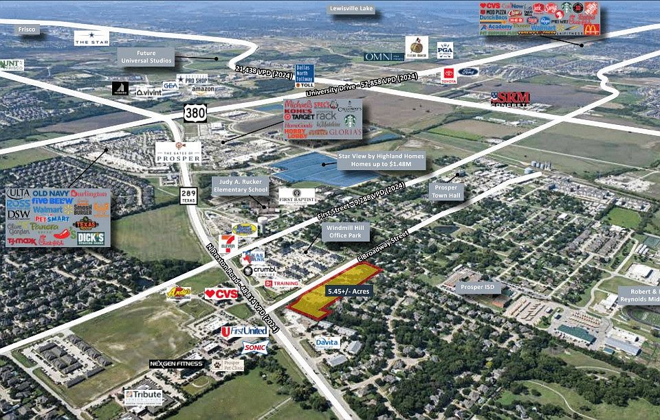 Vanguard Real Estate Advisors (“VREA”) is pleased to present investors and developers the opportunity to acquire 5.45+- acres located along East Broadway Street in the rapidly growing City of Prosper, TX (the “Site”). The Site is positioned along East Broadway Street, and approximately 200 feet west of Preston Road, one of the towns major thoroughfares and commercial corridors. Through PD-118, the Site is zoned for both office and retail uses. Easy access to US-380 and the Dallas North Tollway further enhances regional connectivity, making the Site well-suited for a wide range of commercial uses. This Site is being offered at an attractive price of $22 per square foot for the whole property and $25 per square foot if a purchaser would like to buy a 1-2+- acre pad site out of the overall offering.