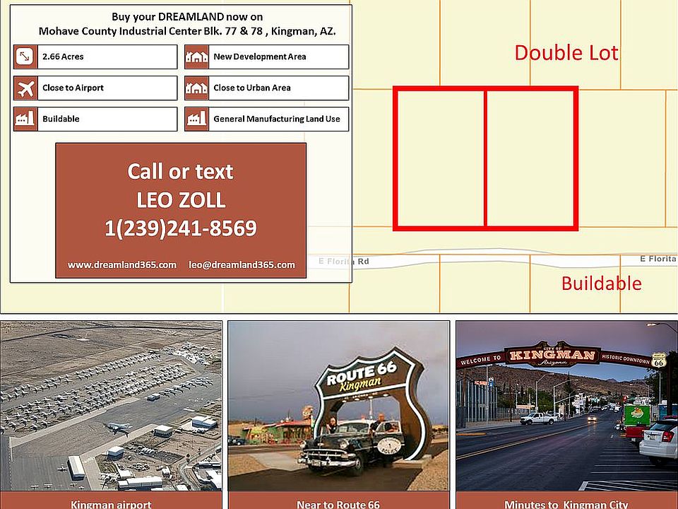 If you’re searching for a industrial zoned property, have a closer look on this one. This vacant, ready to build 2.66 acre lot is in a desert area. Located close to the Route 66 . This is a great lot for general manufacturing uses in locations which are suitable and appropriate taking into consideration the land uses on adjacent or nearby properties, access to major street or highway, rail service or other means of transportation, and the availability of public utilities. Interested? Call or txt us Property Type: Land State: AZ County: MOHAVE APN (Assessor’s Parcel Number): 31309077 & 31309078 Property Address: E Florita Rd City: Kingman Zip: 86401 Size: 2.66 Acre(s) Zoning: Manufacturing and Retail Commercial Road Access: Yes – Unpaved Electricity: Not connected yet Annual Taxes: $ 81.4 Market Value: Similar lots in the area are selling for $15,000. Get this property now for 30% below market value… To buy this property at this discount price call or txt us Don’t miss out on this great deal call or txt us now! Note: We also may have other property at bargain prices just like this available – ask us when you call! Call or text Leo Zoll at (239) 241-8569
