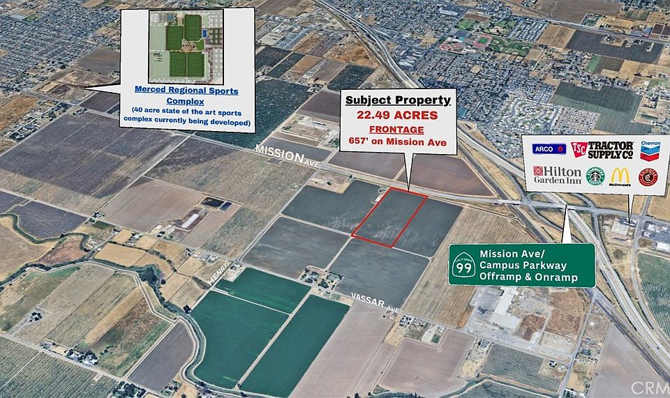 Location, Location! This 22.5+/-acre parcel is part of a 161+/- acre family ranch in the path of development and the City of Merced's Sphere Of Influence, which could be purchased together or separately. It is strategically located w/in close proximity to Hwy 99 and the newly developed Campus Expressway overpass, a direct route to UC Merced. The property is also located within the "Merced Vision 2030" SUDP Boundary, making it well positioned for future growth demand. Future possibilities could include commercial, industrial or residential development for this underserved market area. Also, in close proximity is the Gateway Marketplace, the newest regional commercial development project currently underway. The Gateway Marketplace includes major retailers such as Tractor Supply, Starbucks, McDonald’s, Arco, Chevron and a Hilton Hotel/Convention Center. The city of Merced just broke ground on a 40-acre sports complex just down Mission Ave, dubbed Community Park 42, a major REGIONAL sports complex, allowing for large scale tournaments, concerts, and events. Land running along Mission Ave is quickly becoming the object of attention as residential communities and city infrastructure is being brought further south to accommodate the city's massive growth and grossly underserved commercial/industrial/residential needs. This parcel is also adjacent to Yosemite Wholesale, a 220,000SF