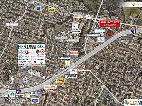 The site boasts excellent traffic counts and visibility directly to Interstate 14 heading into Harker Heights and Killeen. Multiple major retailers such as H.E.B. and Walmart are in close proximity to the site. For utilities, the site has water and wastewater on site. Capacity has yet to be confirmed. The site is zoned Highway Business District.javascript:__doPostBack('m_lbSubmit','')
