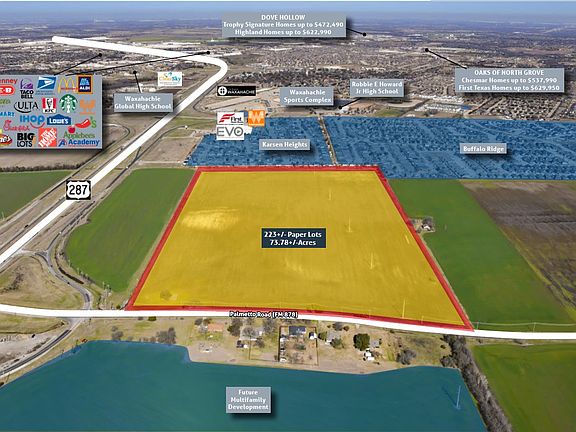 Vanguard Real Estate Advisors (VREA) has been exclusively retained by ownership to offer home builders and developers the opportunity to acquire 223 single-family paper lots (the Site) located along FM 878 in Waxahachie, TX. The Site is located directly east of Highway 287 and 4 miles from Interstate 35. Ownership’s preliminary construction plans reflect 223 single family lots, with a lot size of primarily 70 x 120; Ownership indicated these plans need to be resubmitted to the city prior to starting development. The Planned Development Zoning requires a minimum dwelling size of 2,000 square feet. The Site is served by Waxahachie ISD, which holds an A- rating per Niche.com. This Site represents an exceptional opportunity to acquire entitled single family lots in a thriving DFW metroplex suburb at only $29,950 per paper lot. Seller Financing available for select groups. Please call for additional details.