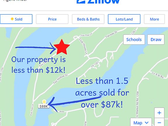 INCREDIBLE deal-less than $12k for over 1/4 an acre! This peaceful property sits next to Table Rock Lake in the Kings River Village community which includes a clubhouse, pool, playground, and hiking trails. Walking distance to the Lake, just seconds away from great fishing, boating, and camping. This is a very unique piece of land that does not come around often, and we’re offering it for a rock bottom price. Do not miss this opportunity to build your dream home or the vacation home you’ve been hoping for! This lot has close proximity to great local attractions: Dogwood Canyon (20 minutes), Roaring River State Park (30 minutes), Ozark National Forest (75 minutes), and Branson, MO (50 minutes). Property Summary: Incredible 0.34 acres lot in Shell Knob, MO. Just 10 minutes from the Arkansas line, this property is the perfect location for your dream home! Walking distance to Table Rock Lake and access to the neighborhood pool/clubhouse. We are offering this property at a discounted ROCK BOTTOM cash price so that one lucky buyer can own the perfect property at a BELOW MARKET price. Call Matt now: 910-773-3110. Property Value: The Market Value for the BEAUTIFUL lot is around $20,000 based on recent property sales in the area. Buy it today for only $11,997! We are also offering this property with a very affordable, no credit check seller financing. See below for details. We love to work with buyers to help ensure the best deal that suits any budgeting needs. Property Details APN: 30-6.0-14-000-000-0011.042 Property type: Residential Vacant Land Property Address: 0 Fox Fire Lane GPS Coordinates (Approximate Center): 36.5241508, -93.616849 City: Shell Knob Zip: 65747 Acres: 0.34 Approximate Dimensions: 100 x 150 x 100 x 150 Mobile Homes Allowed: No Water: Available Electricity: Available Sewer: Available Purchase Options: We are currently offering 2 ways to buy this beautiful property. Buy it seller-financed at $11,997 with $4,499 down. The monthly payments could be as low as $172.27 per month for 84 months. This is a fully amortized loan with NO CREDIT CHECK or prepayment penalty. Or, cash Price of $11,997, a total savings of $2,000 by purchasing in cash! Call us now: 910-773-3110!! Ready or Considering Buying: Purchasing property from us is simple and easy. We have closed hundreds of real estate transactions and know the process well. We always use a 3rd party title company to make sure our buyers are protected and ensure title is free and clear. Message us here or call us today to get started. Disclaimer: The buyer is responsible for verifying all information with the County as to what can and can't be done with the property. The buyer will need to work with the County to obtain the proper permits if needed. The buyer will also need to confirm the availability of any utilities needed or serviced on the property. The seller makes no warranties or representations about the land, its condition, or what can be built on the property
