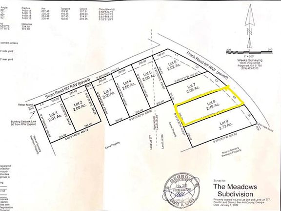 The Meadows is a new subdivision based in Fitzgerald located close to the new Fitzgerald High School and Career Academy, but off the main throughfare to avoid the congestion and traffic. The Meadows is located on the corner of Frank Rd & Swan Road. The covenants are 1800 square feet of heated/cooled square feet. The homes will need to be of hardy board or brick exterior, and each lot is 2-3 acres with paved road frontage. This particular lot is located on Frank Rd with such access and is 2.49 acre property that is flat and ready to become the starting point of building your dream with confidence and in a great location! Call today for more information.