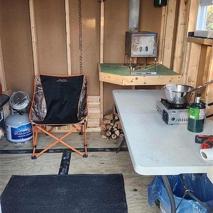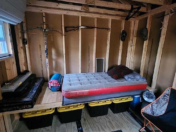 A rustic cabin provides a comfortable base camp with sleeping space, storage, and room for hunting or outdoor gear. Outside, a fire pit area with string lighting creates a perfect spot for relaxing evenings under the trees.