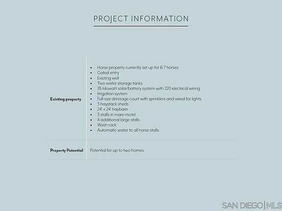 • 2.76 acres • Horse property currently set up for 6-7 horses • Gated entry • Existing well • Two water storage tanks • 35 kilowatt solar/battery system with 220 electrical wiring • Irrigation system • Full-size dressage court with sprinklers and wired for lights • 3 haystack sheds • 24’ x 24’ haybarn • 3 stalls in mare motel • 4 additional large stalls • Wash rack • Automatic water to all horse stalls