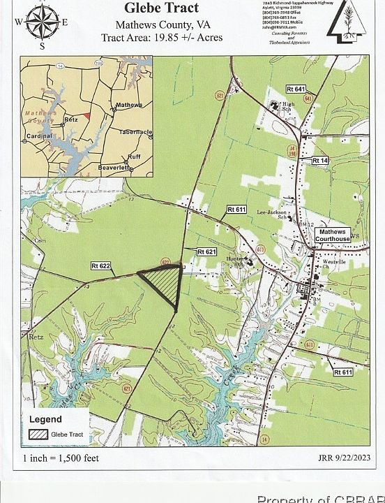 WONDERFUL LOCATION - JUST APPROX. A MILE TO VILLAGE OF MATHEWS. Fronts on Glebe Road and Long Road, 19.85 acres of Woods land with timber value estimate Fall of 2023. No soil work has been done. Multiple possibilities with this beautiful private acreage including single family dwelling, recreational, hunting and timber value. There is internet and power available at the state roads. Only 20 minutes to Gloucester Court House. Call to see this beautiful parcel of land.