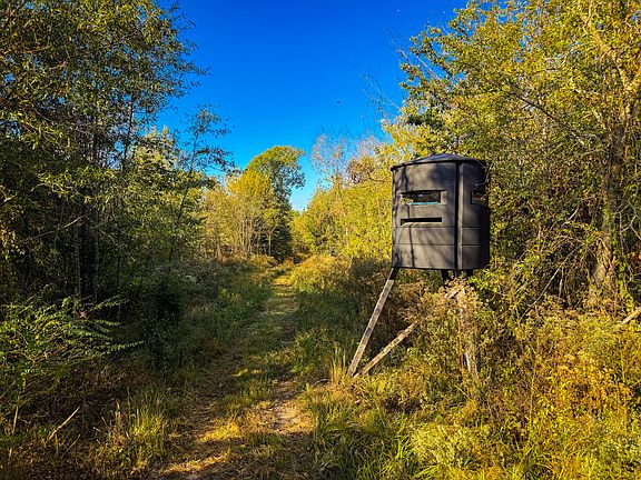 The land has a proven wildlife-rich history with signs of consistent deer and turkey movement throughout the property. Three established food plots are already in place and designed to support seasonal attraction and hold game. Two elevated sportsman condos offer ready-to-use hunting setups and potential for overnight stays or weekend retreats. Multiple sloughs and small creeks run across the property, adding significant waterfowl potential and creating natural edge habitats.