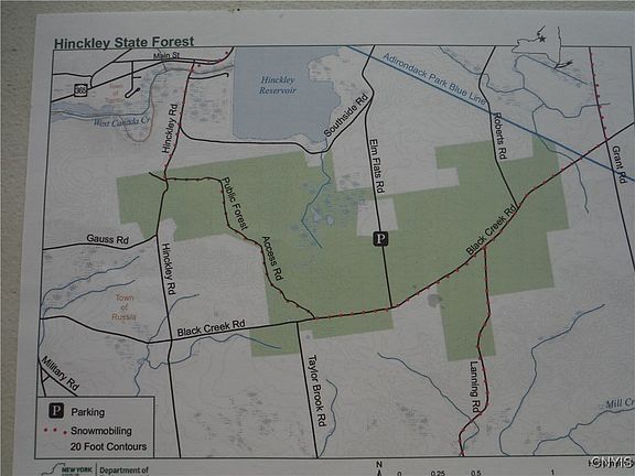 Talk about privacy ! 100 wooded acres with many signs of game- deer/bear/turkey and game birds. This is on a Seasonal Maintained Road and would be Off The Grid. The view from the top of the "cliffs" is gorgeous- what a spot to build a cabin or seasonal getaway! Look over the West Canada Creek past Rt 365! It wouldn't be too difficult to create/brushhog an ATV or Vehicle Road to the waterview landing- Not any steep ravines on that part of the lot. There is a groomed Snowmobile trail at bottom of the road.(Ohio Ridge Runners) The land Partial borders Hinckley State Forest & Adirondack Forest Lands of 900+ acres and is Not in Adirondack Park boundary. It is easier to go to the left of the locked gate and walk thru the state forest hard woods- rough walking thru the gate with berry bushes. Really should have GPS APP such as Huntstand or OnX to guide thru the lot! When you get to the water view side-be very careful as the Cliffs are steep/dangerous- the water side boundary is owned by the Hydro Power Company (map in attachments). Iroquois Gas Company also has an easement on the far left border of the property. This is a wonderful, peaceful piece of property that could have many uses!