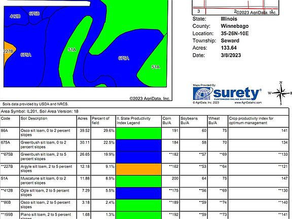 Outstanding Class "A" grain farm located just Southwest of Winnebago. The PI on this farm is 135.7 and features a high percentage of Osco and Muscatune soils. This farm offers frontage on Hoisington Rd and is all tillable. The farm is leased for 2024, available for 2025. This is a great investment opportunity or addition to your farming operation. This farm is also offered with 199.72 acres approximately 4 miles away for as total of 333.37 acres. (Taxes shown affect more than the parcel being sold. Taxes on this parcel only are estimated at $6,682).