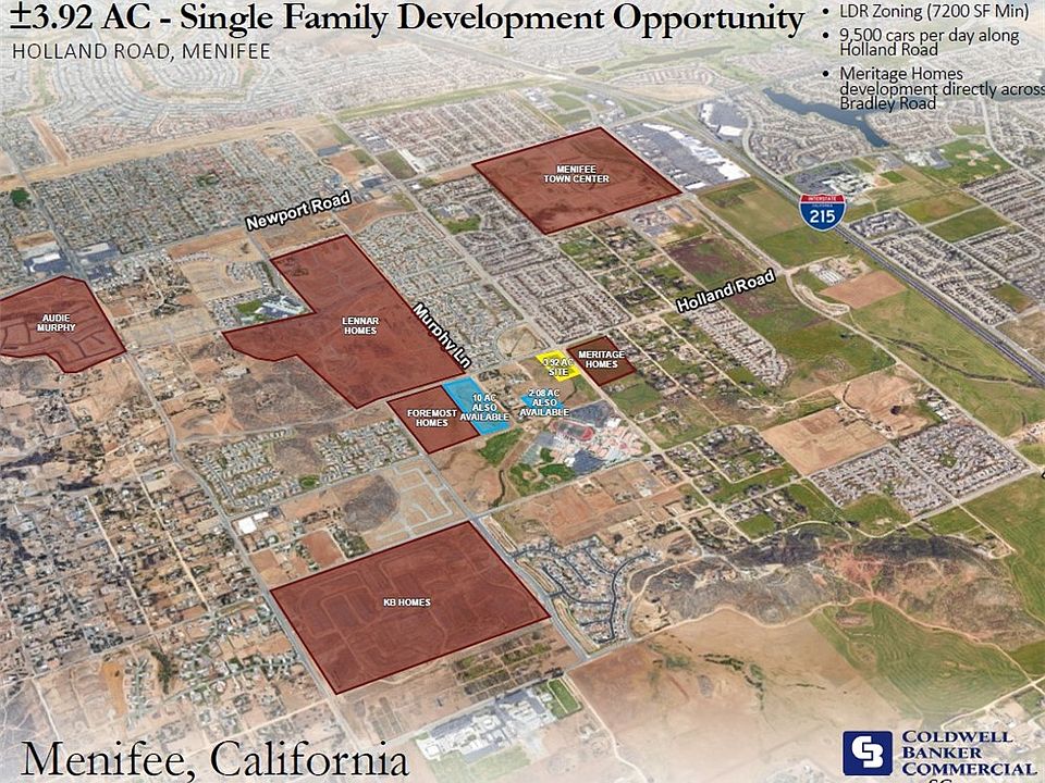 The subject property is approximately 3.92 acres in size and is located in Menifee, California. The property is relatively flat in topography and has approximately 330 feet of frontage on Holland Rd. To the south of the property is Paloma Valley High School. To the west are a group of 12 lots with the potential to assemble more properties. To the north of the property are 451 low density (approx. 7,200 SF) lots that are under construction with Lennar. To the west of the subject property is 29.29 acres that Foremost is currently grading for a single-family development project. To the west of the property across Bradley Road, Meritage Homes recently completed the construction of 75 single family homes that are completely sold out.