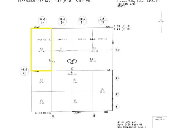 The offering consists of approximately 84.03 acres of land located in Lucerne Valley in San Bernardino County. The property itself is entirely flat with dessert terrain and has roughly 1,200 feet of frontage on Holmes Road. The site is less than a mile from Highway 247 / Barstow Road which leads to Barstow to the north and about 3 miles form Highway 18 which leads into Victorville and Hesperia to the west and Big Bear to the southeast. Additionally, the property is within a close proximity to Lucerne Valley High School and the Rancho Lucerne Master Plan. Water service in Lucerne Valley is provided by Golden State Water Company and power is provided by Southern California Edison. Please reach out with any questions or interest in this opportunity.