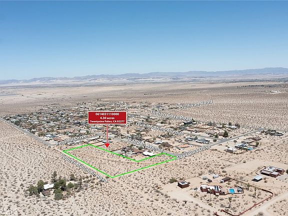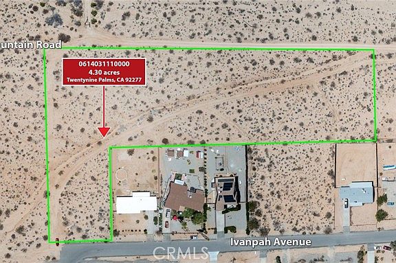 Vacant land in Twentynine Palms 187,308 sqft lot. 4.3 acers. The land is level ready to build or circulate a lot and leave it as an investment. The buyer is to investigate all matters regarding zoning, permits etc. Neighbors have a nice large house next door with water service, valued at $380,000 3 bed 2 bath 1500 sqft. To get there, take Freeway 62 passing these cities: Morongo Valley, Palms Wells, Yucca Valley, Joshua Tree, Panorama Heights and you'll arrive at Twenty-Nine Palms. Good luck, if you like it, don't miss this opportunity. The seller is very motivated.