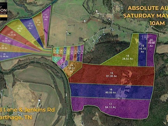 *** SELLING AT ABSOLUTE AUCTION Saturday May 4, 2024 @ 10am *** 411 PICTURESQUE ACRES • SELLING IN 28 TRACTS • TRACTS RANGING IN SIZE FROM 1.02 TO 81.30 ACRES • TRACTS 21-28 CUMBERLAND RIVER ACCESS • All Lots Fronting Whitefield Lane and Jenkins Road, Land Lays Level to Rolling, Consists of Open Fields, Pasture Land, Wooded Areas. All tracts have been Soils Tested and Septic Approved (details sale date). Utility Water. Restricted to 1,400 sq. ft. Minimum Size Site Built Homes - Barndominiums Allowed. No Mobile or Modular Homes. Prime Building Lots! Mini-Farms - Acreage and Recreational Tracts. Filled with Abundant Wildlife, Deer, Turkey, Homestead and Greenbelt Opportunity. Contact Auctioneer Jay White for Further Information 615-308-4421 or Ricky Thorne 615-347-4285. Land Open for Inspection • Look at Your Convenience. Property Taxes May Change.