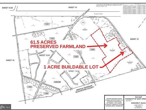 Welcome to your future homestead or agricultural escape—61.5 acres of preserved farmland in one of Gloucester County’s most desirable locations. Tucked away in scenic East Greenwich Township and within the sought-after Kingsway Regional School District, this exceptional parcel offers both seclusion and accessibility. Enjoy approximately 47.6 acres of tillable land, currently leased to a local farmer, along with +/-7.3 wooded acres and +/-6.5 acres of natural wetlands, perfect for hiking, wildlife observation, or creating your own private sanctuary. The soil consists primarily of Freehold loamy sand and Freehold sandy loam, supporting a variety of agricultural uses. A 1-acre non-severable exception area is available for you to build your dream home—imagine waking up every day to panoramic farm views, with the added benefit of low farm-assessed property taxes. There are currently no existing structures, giving you a clean slate for a custom residence or even potential equestrian facilities, barns, or workshops (buyer to perform due diligence for all intended uses). Whether you’re dreaming of a working farm, a private retreat, or a combination of both, this rare offering combines rural charm with top-tier location. Don't miss this chance to secure your piece of South Jersey countryside.