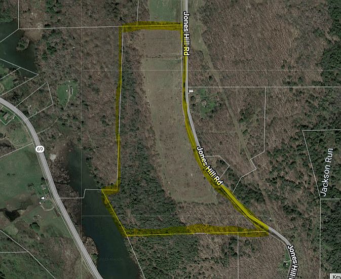 The parcel is approximately half cleared and half wooded, with substantial road frontage along Jones Hill Road.