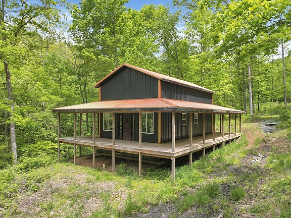 This property also offers a black pole-barn style off-grid cabin with copper metal roof and complete wrap around porch to soak in the views. This cabin is a blank slate and will require finish work, but has the potential to be a dream property, whether a personal getaway, hunter's retreat, private residence, or investment property.