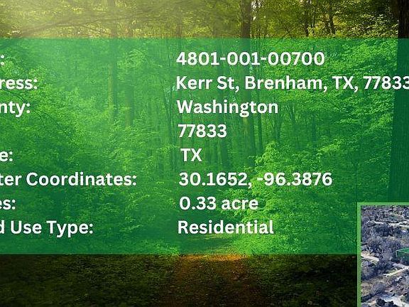 Located in the heart of Brenham, TX, this 0.33-acre residential lot on Kerr St offers a fantastic opportunity to build your dream home or invest in a growing community. With close proximity to city parks, local attractions, and essential amenities, this property combines convenience with small-town charm. Don't miss out on this well-located residential lot in Brenham, TX. Contact us today to learn more or schedule a site visit.