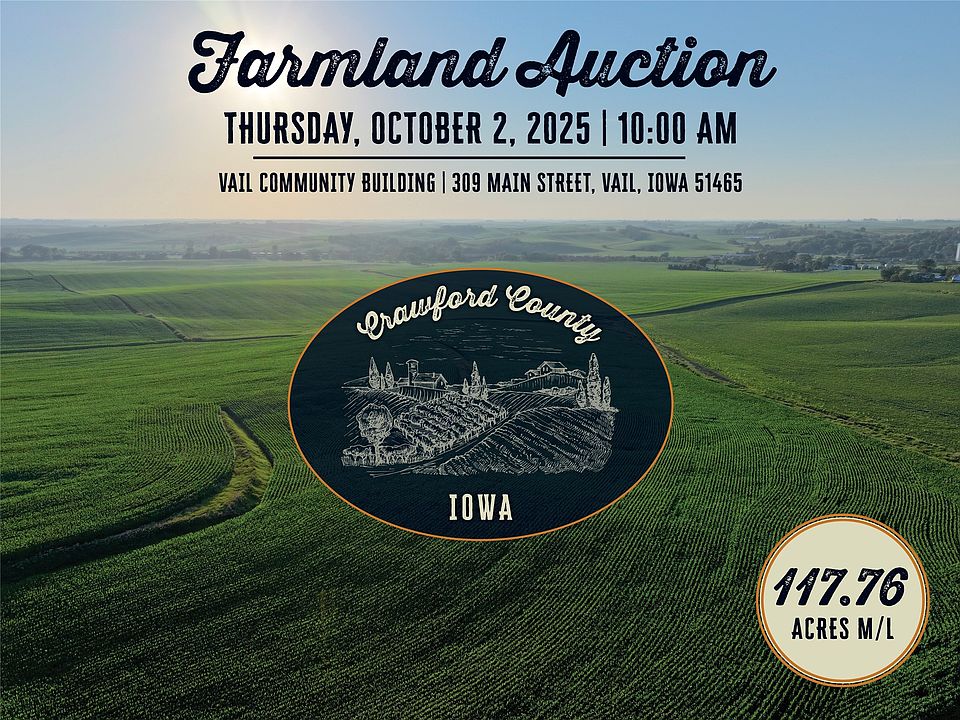 The single tract will be offered on a price-per-acre basis via Public Auction and will take place on Thursday, October 2nd, 2025, at 10:00 AM in the Vail Community Building in Vail, Iowa. This auction can also be viewed through a Virtual Online Auction option, and online bidding will be available.