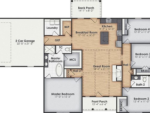 The Abernathy is a fantastic single-story home with 4 bedrooms and 2 bathrooms. The exceptional floor plan includes a great room overlooking the front porch. Upon entry, you’ll find the great room complete with a vaulted ceiling and direct access to the kitchen and breakfast room. The kitchen features a serving island and a window over the sink with views of the backyard. A shared hallway leads to the oversized walk-in pantry, laundry room, and two-car garage. Designed with a split-bedroom layout, the master suite includes a walk-in closet, spa-like bath with skirted tub, tile walk-in shower, dual vanities, and separate toilet closet. Three additional bedrooms, each generously sized, and share a full bath.