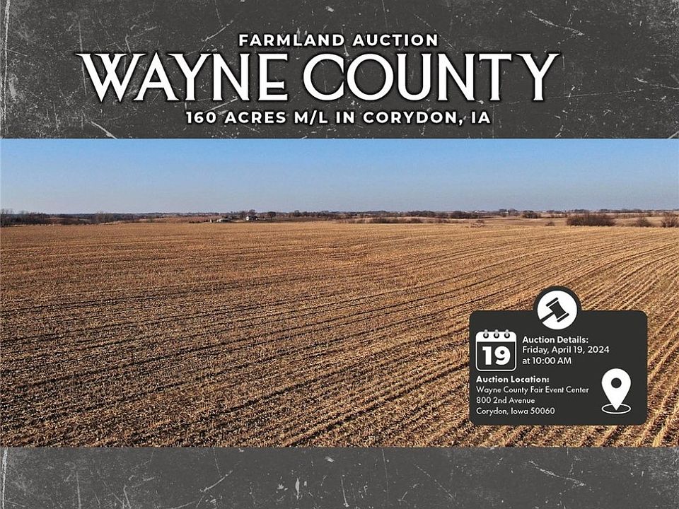 Wayne County, Iowa Farmland Auction - Mark your calendar for Friday, April 19th, 2024, at 10:00 AM CST! We are pleased to be offering 160 acres m/l of highly tillable farmland in Wayne County, Iowa with 2024 farming rights available!! Early possession will be granted to successful Buyer, see Terms and Conditions for additional information.