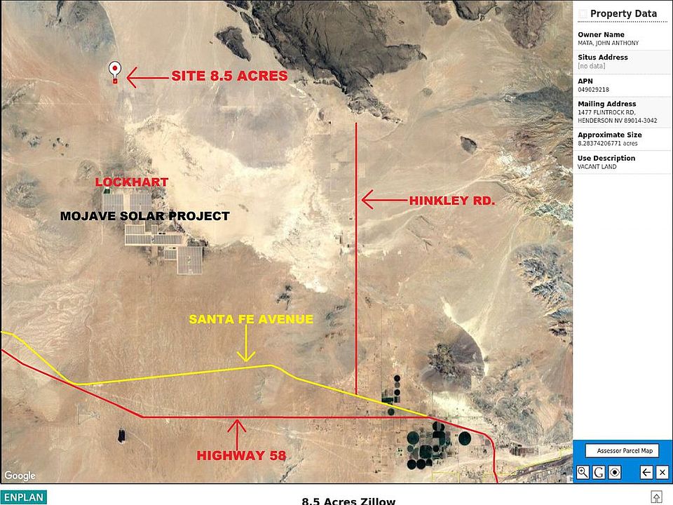 Parcel # 0490-292-18-0000 FOR SALE: This lot consisting of 8.5 Acres is located 3.5 miles North of the New Solar plant in the Lockhart - Hinkley vicinity. This parcel has had various offers from private land acquisition companies the last 5 years. Every few months I get a letter in the mail making me a low ball offer to purchase the land. The land is potentially good investment property. I'm willing to let it go for a reasonable offer. I WILL CONSIDER ANY AND ALL OFFERS. You can call or send me a text to 702-557-5427 with your offer, and I will respond within 24 hours. Thanks for looking.