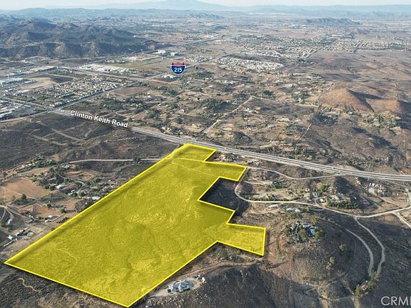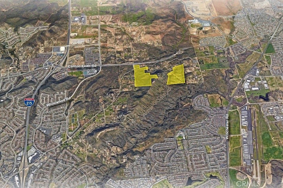 The property consists of five parcels that make up approximately 104.5 acres of raw land in Murrieta, CA. Three of the five parcels (APN’s: 900-020-021,023,026) are adjoined starting at the intersection of Clinton Keith Rd and Menifee Rd, extending about a half-of a-mile to the south. This portion of the property makes up nearly 59 acres while the other two parcels to the east (APN’s: 900-020-014,015) make up the remaining +/- 45 acres of the property. In terms of the property’s location, it sits about 1.2 miles from the I-215 interchange at Clinton Keith Road where there is large retail presence, approximately 2 miles from Highway 79 access, and has multiple schools in a 2-mile radius. Per the Eastern Municipal Water District, the nearest water and sewer access to the site is at the corner of Whitewood Rd and Clinton Keith Road to the west of the property.