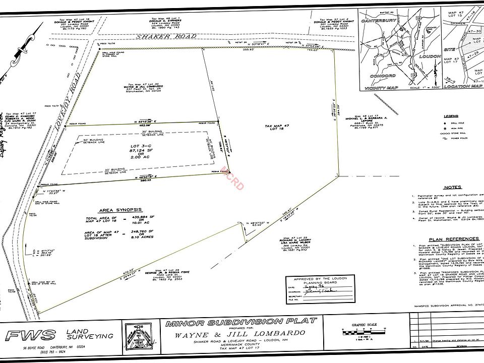 A rare find! Building lots being sold in 1 package and has strong opportunity for additional development, if you choose. There is a corner 2 acre approved building lot with road frontage on Lovejoy and Old SHaker Rd. There is also an 8 acre parcel for a gorgeous building lot OR divide it up into several lots. Attached is a proposed plan that was approved by town and recorded back in 1988. for a proposal of up to 4 lots. Since then, ordinances have change so would require a new approval with town. Being sold as is and buyer responsible for current use tax.