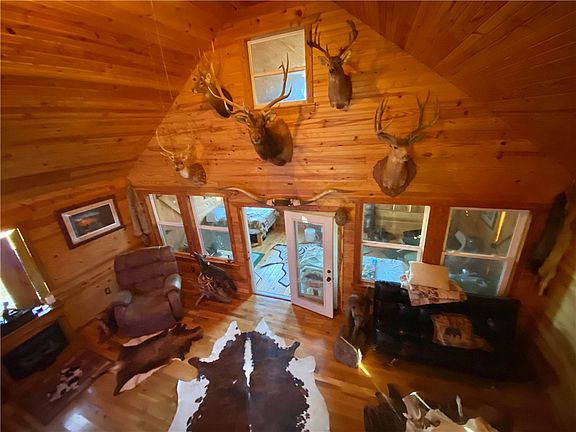 Off grid cabin on 60 acres with breathtaking views of the peaceful Ozark mountains that surround. Overlook the stocked pond from your custom built cabin with wrap around deck, kitchen, full bath, and loft area. Cabin features septic and spring fed well. The lean to shed is a perfect spot to park your toys. Plenty of trails on the property. Legal easement to property.