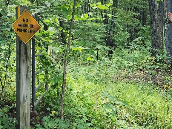 Logging trail at gateSeasonal country roadLots of mixed hardwoods