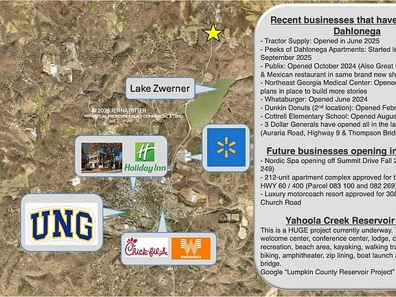 Welcome to Dahlonega – the picturesque, Hallmark-style town that just keeps growing! With the University of North Georgia (part of the fastest-growing university system in Georgia), a flourishing wine industry (dubbed the Napa Valley of the South), a booming destination wedding market, deep gold rush nostalgia, and abundant outdoor recreation, people are pouring in, spending big and even putting down roots. And with that growth comes demand. Dahlonega needs more goods, services, and experiences to support both the local community and a constant influx of tourists. This property is perfectly positioned to fill those gaps and bring your vision to life | PRIME LOCATION & SITE FEATURES | 658 feet of frontage on US Hwy 19/60 (high traffic visibility) – minutes from Historic Dahlonega Square – surrounded by high-density housing – right down the road from the county’s est. $70MM Lake Zwerner/Yahoola Creek Reservoir Master Plan (set to include: amphitheater, zip-lining, hiking & biking trails, beach area, RV camping) | PROPERTY DETAILS | 12.62 acres | ZONING & DEVELOPMENT POTENTIAL | character area – Community Village Center (flexible uses including commercial, retail, and residential) – County parcel with option to annex into the City for access to City water & sewer – surrounded by City-zoned commercial (makes future development more adaptable) – additional acreage available to the north for larger-scale visions. Owner/agent. Owner financing available for 20% down, 10% interest only, 24 month balloon (terms negotiable).