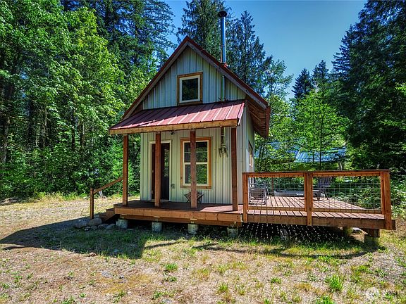 Storybook tiny home retreat on over an acre! This enchanting cabin reflects the heart & love poured into its design. Warm wood interior, efficient space-saving features, kitchenette w/sink, microwave, mini fridge, cozy wood stove + a spacious loft! Expansive windows fill the home w/natural light, highlighting the beautiful finishes. Outdoor living takes center stage w/level, usable grounds ideal for recreation or relaxation. A unique zipline adds an element of fun and adventure, while a large storage container provides flexible use for workspace or toys. Every detail of this property was created to inspire joy, connection and lasting memories. This getaway is within 20 minutes to Steven's pass, making it the perfect home base to recreation!