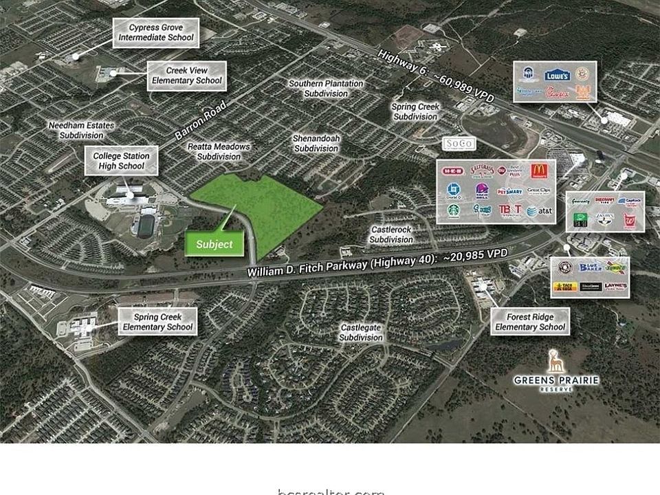 Designated "urban" in city's comprehensive plan for intense land use such as general commercial activities, office, townhomes, apartments, and vertical mixed-use. At the epicenter of growth near College Station High School. 1/2 mile of frontage along Victoria Avenue. All public utilities in the immediate area reducing cost of off-site improvements. New traffic and pedestrian signals at the intersection of William D. Fitch & Victoria Ave.